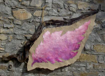 Acrylic on hand-made paper,stitched together, and hung by a tree/root-system